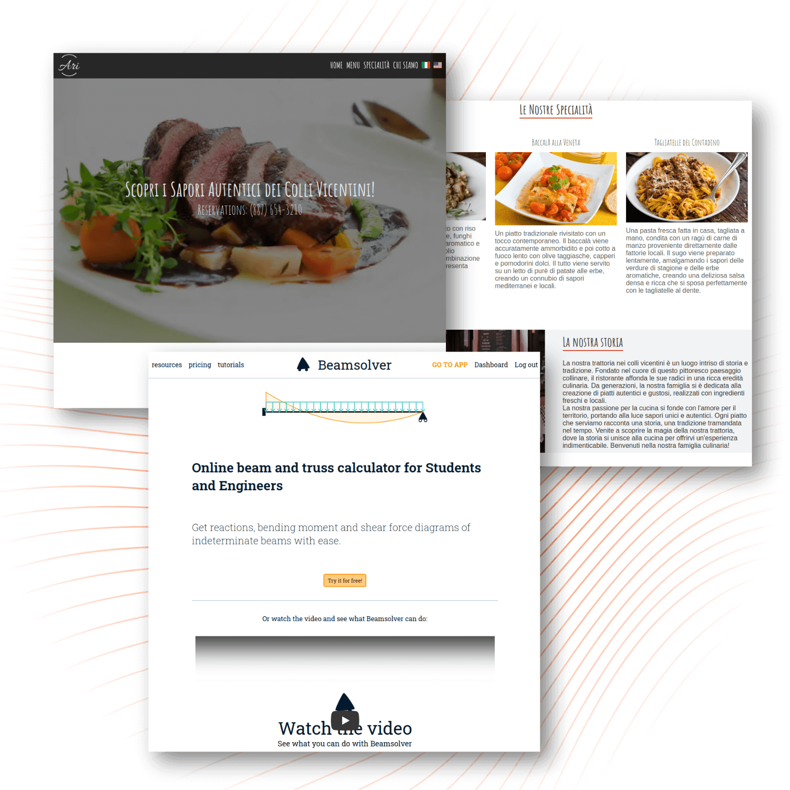 I miei siti vetrina sono realizzati interamente in html, css e javascript, senza l'ausilio di webpage builders o front-end frameworks che appesantiscono il prodotto finale, rendendolo più costoso e meno longevo.